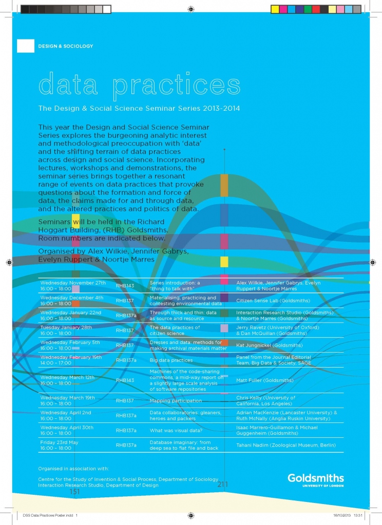 Annual Design and Social Science annual seminar series. Co-organized by Jennifer Gabrys, Alex Wilkie, Evelyn Ruppert, and Noortje Marres (Interaction Research Studio and CSISP). Speakers included Citizen Sense, Interaction Research Studio, Kat Jungnickel, Big Data & Society editorial team, Matthew Fuller, Chris Kelty, Adrian Mackenzie and Ruth McNally, Isaac Marrero-Guillamon and Michael Guggenheim, and Tahani Nadim. Goldsmiths, University of London, UK (2013-14).
